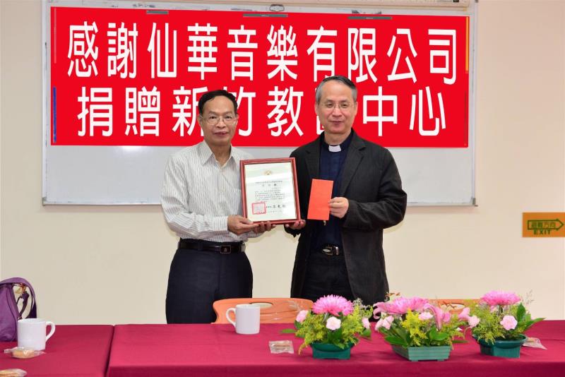 仙華音樂公司董事長少龍,日前(11/20)前往天主教新竹教區主教公署,捐贈愛心款項,支持該教區從事慈善、教育等工作,主教李克勉和修女代表們接受頒贈。